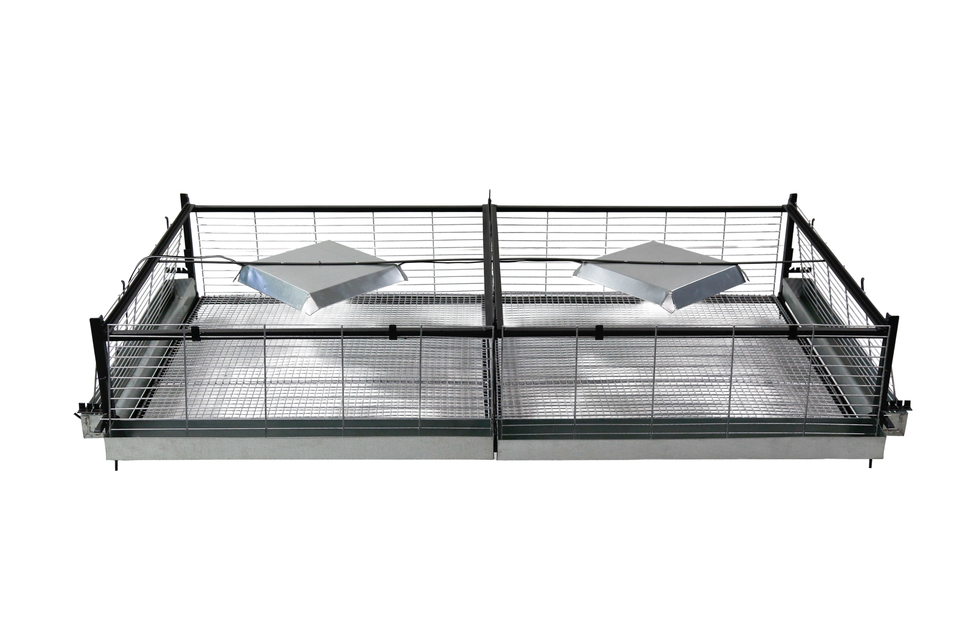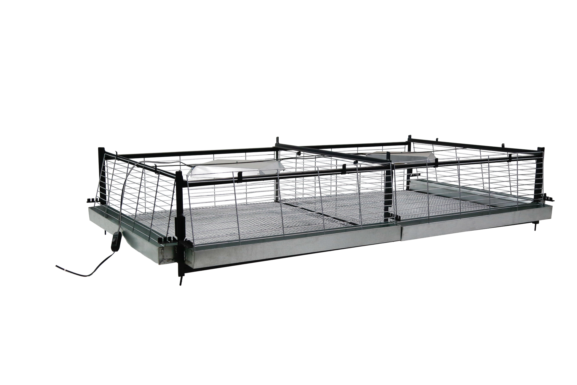 Andar sem base da criadeira (CR01) para pintinhos/codornas com capacidade para até 200 pintinhos/codornas de um dia. Estrutura em ferro com pintura em zarcão (em cantoneira 5/8" e 3/4). Acompanha instalação elétrica, campânulas com coquete E-27 e um interruptor para cada andar. Possui fechamento com regulagem externa confeccionada em arame no 12 e 14 galvanizado, com separação de pintinhos. Inclui também a bandeja para resíduos de fezes, comedouros e bebedouros em chapa pintura esmalte sintético alumínio, porta de correr e divisória interna removível para a galvanizada