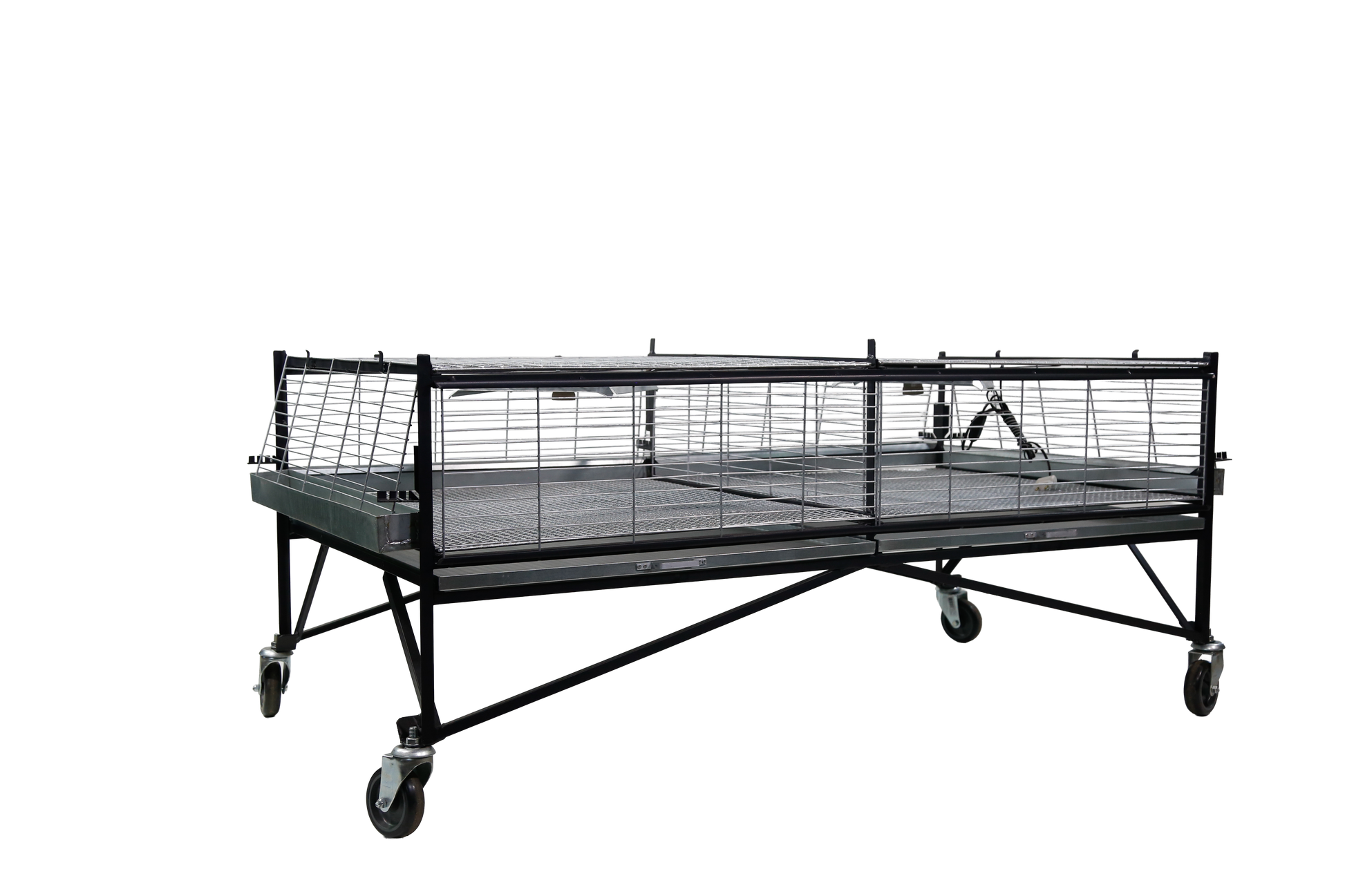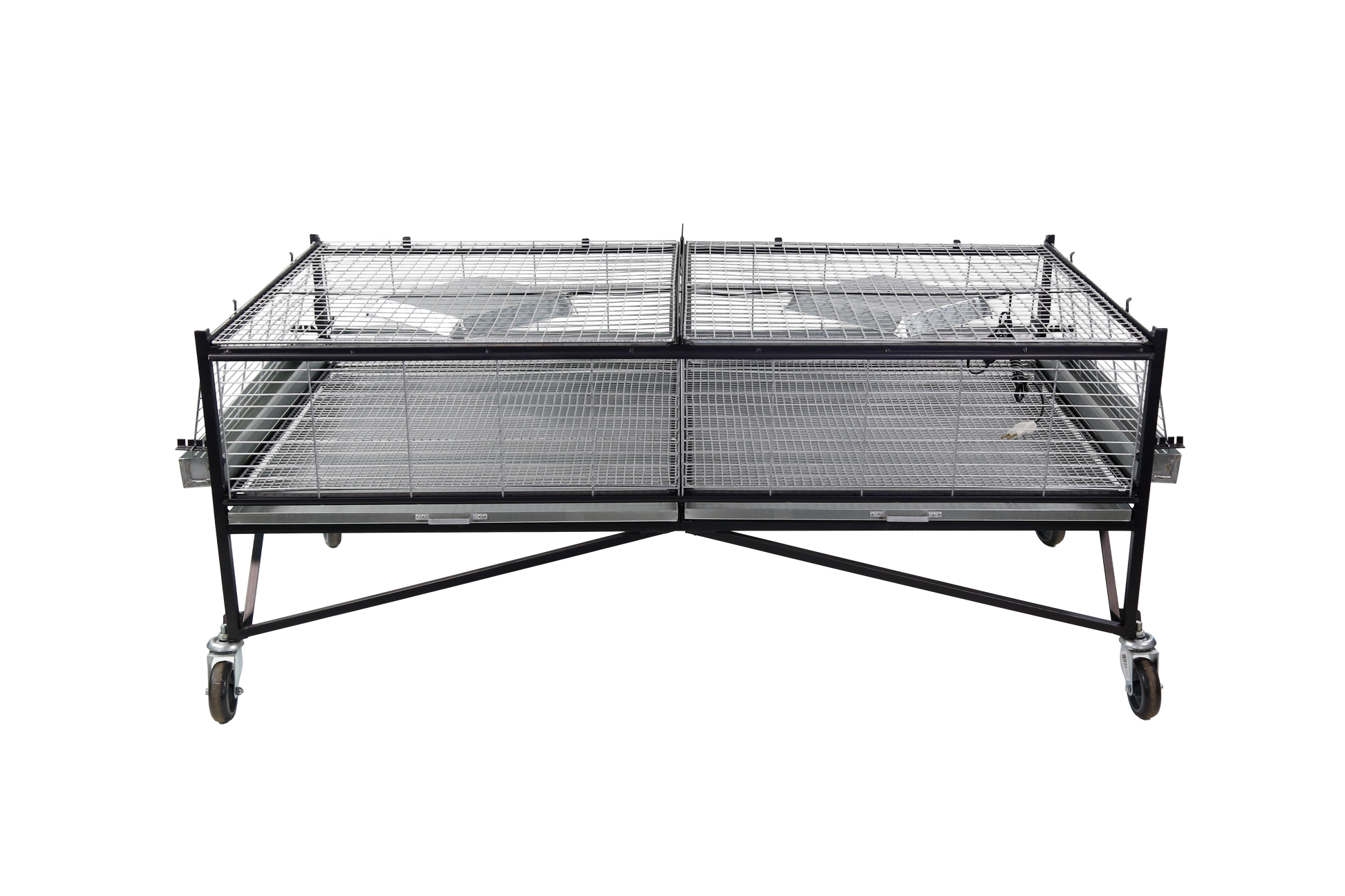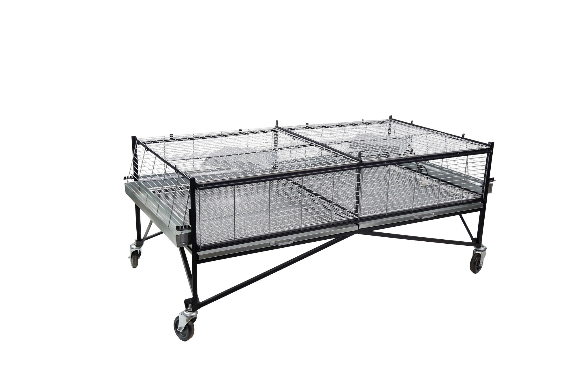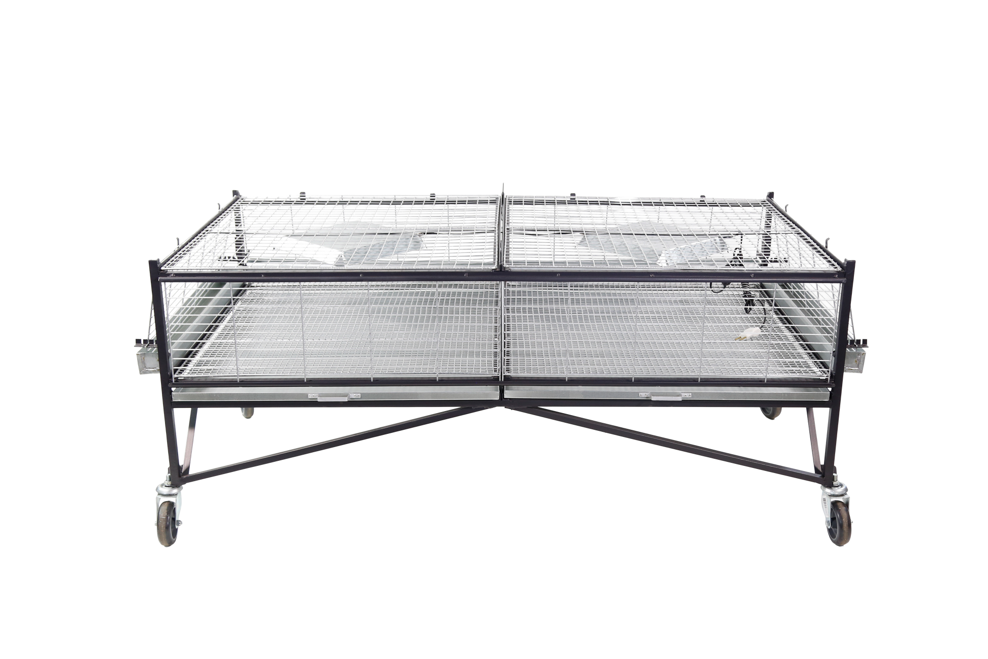 Base da criadeira (CR01) para pintinhos/codornas com capacidade para até 200 pintinhos de um dia. Estrutura em ferro com pintura em zarcão (em cantoneira 5/8" e 3/4"). Acompanha instalação elétrica, campânulas com soquete E-27 e um interruptor para cada andar. Possui fechamento com regulagem externa confeccionada em arame no 12 e 14 galvanizado, com pintura esmalte sintético alumínio, porta de correr e divisória interna removível para a separação de pintinhos. Inclui também a bandeja para resíduos de fezes, comedouros e bebedouros em chapa galvanizada.