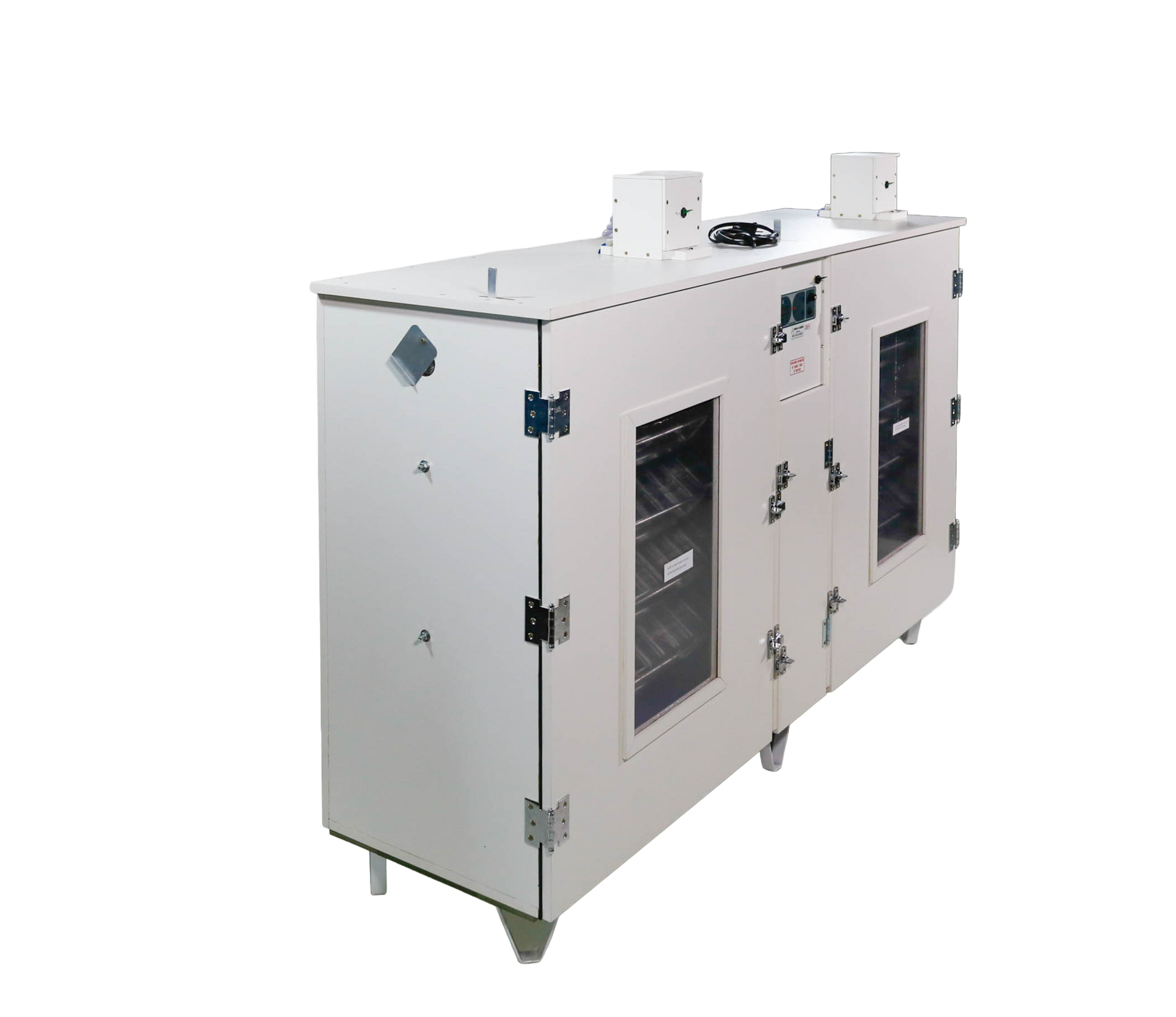 Chocadeira Elétrica para 728 ovos de galinha de uma vez só ou 728 ovos no Sistema Rodízio (182 ovos de galinha de 6 em 6 dias), confeccionada em mdf (Medium Density Fiberboard) branco, mais resistente a umidade; e pés metálicos com pintura eletrostática branca. Possui estrutura interna para oito bandejas. Acompanha as bandejas de viração de ovos e de eclosão. A viração de ovos é automática, temperatura digital, possui regulador automático de Voltagem, manter a bandeja com água.