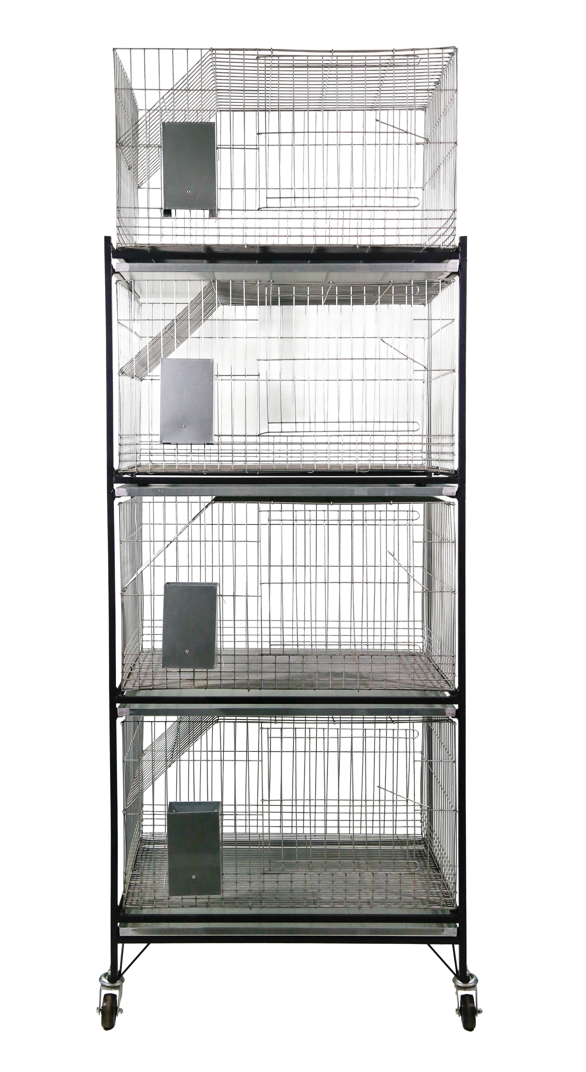 EXPOSITOR C06 COM CAPACIDADE PARA ATÉ 4 GAIOLAS PARA COELHOS (C01), COM ESTRUTURA DE FERRO COM PINTURA ZARCÃO(EMCANTONEIRA 5/8"), INCLUEM BANDEJAS PARA RESIDUOS DE FEZES E COMEDOUROS, AMBOS, EM CHAPAS GALVENIZADA. OBS: COMEDOURO COM CHAPA GALVENIZADA COM REPOSIÇÃO DO ALIMENTO PELA PARTE EXTERNA DA GAIOLA