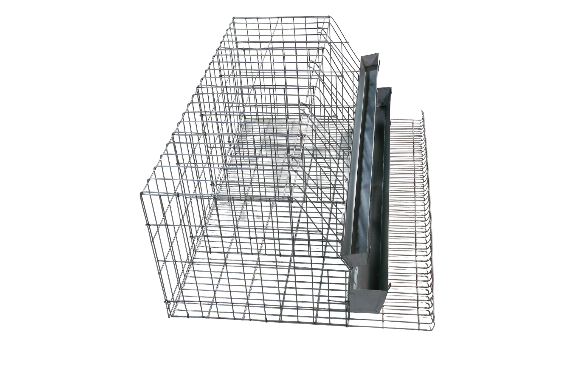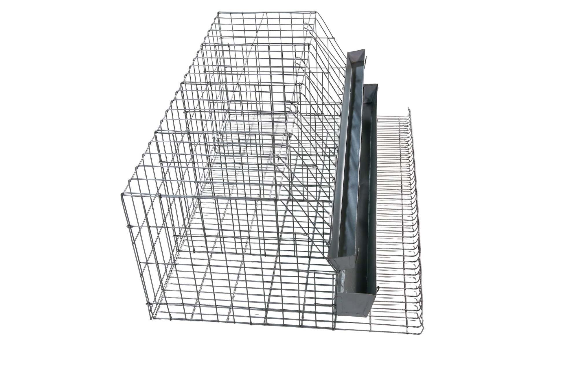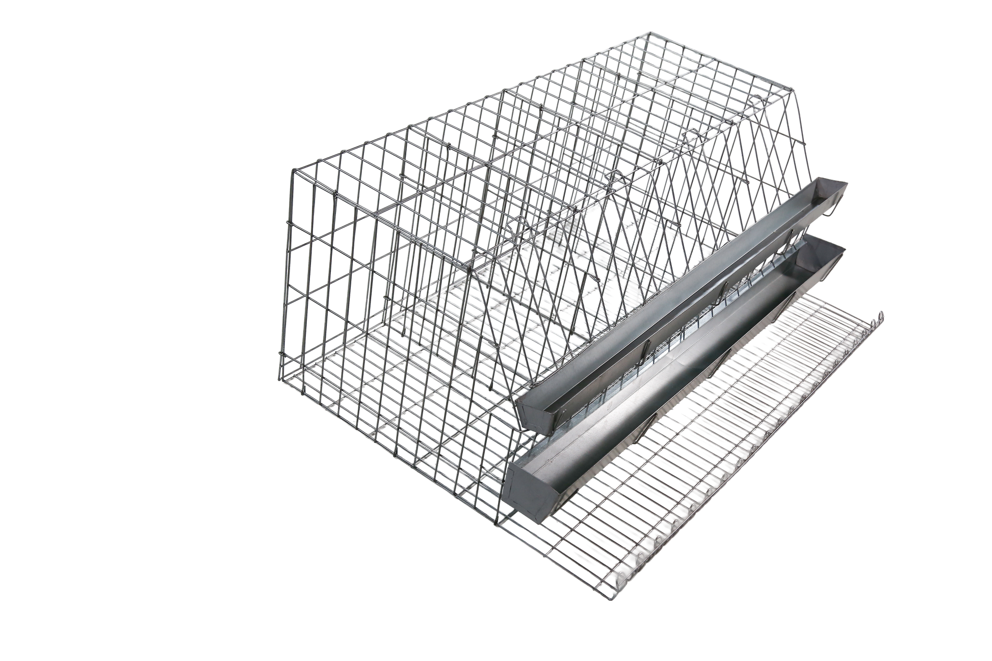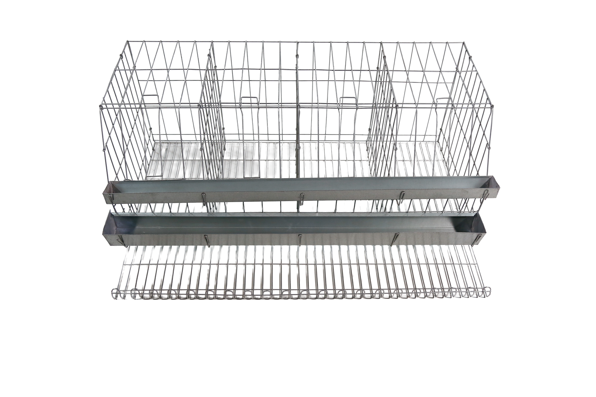 Gaiola para galinha de postura com 4 boxes, capacidade para até 8 aves. Confeccionada em arame no 12 galvanizado. Pintura esmalte sintético alumínio. Acompanha comedouro e bebedouro em chapa galvanizada. OBS.: Não acompanha bandeja para resíduos de fezes.